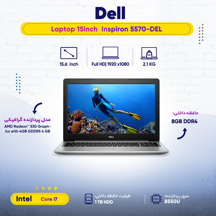 لپ تاپ Dell Inspiron 5570 از سری لپ تاپ های قدرتمند و جدید خانواده اينسپايرون و از سری 5000 کمپانی بزرگ دل میباشد. بدنه این مدل براق ، صاف و صیقلی و در عین حال بسیار زیبا و مشتری پسند است و در رنگهای سفید، نقرهای ومشکی عرضه شده و توانسته نظر بسیاری از کاربران را به خود جلب نماید. این دستگاه با آخرین متد روز طراحی شده و از پردازنده قدرتمند اینتل نسل هشتم (i5-8250U 6MB Cache و i7-8550U 8 MB Cache) استفاده میکند. صفحه نمایش این دستگاه مات و در ابعاد 15.6 اینچ از نوع Full HD بوده که برای امور گرافیکی و مالتی مدیا بسیار کاربردی است . در این مدل از چیپ گرافیک AMD Radeom 530 DDR5 با حجم دو و چهار گیگا بایت و حافظه رم از نوع DDR4 تا 32 گیگابایت و همچنین قابلیت نصب هاردهای معمولی و M.2 را به صورت هم زمان دارد . وزن این دستگاه حدودا دو کیلوگرم است. این دستگاه شامل درگاه کارتخوان، یک درگاه USB 2.0، درایو نوری و قفل کنسینگتون در سمت راست دستگاه و پورت شبکه ، HDMI، دو درگاه USB 3.1 Gen 1 Type-A در سمت چپ است. این دستگاه دارای حسگر اثرانگشت می باشد. در مجموع میتوان این مدل از لپتاپهای دل را یک دستگاه نیمه حرفهای و حرفهای با قیمت مناسب برای این برند نامید که نظر کاربران را متوجه خود خواهد کرد.