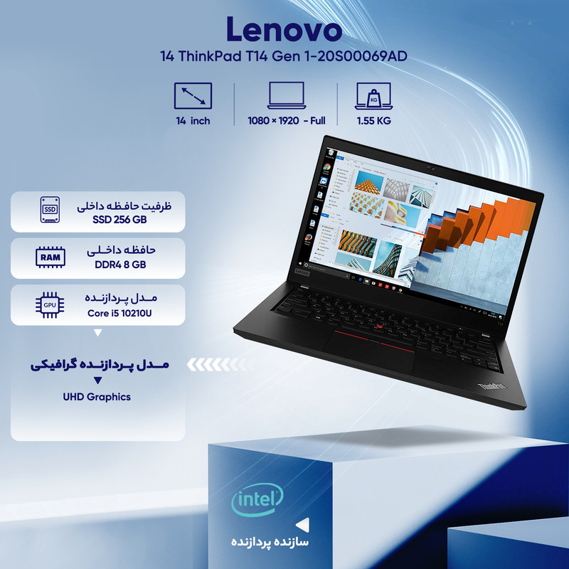 سری ThinkPad لپ تاپهای لنوو بسیار پرطرفدار است. این سری جز لپ تاپهای میان رده این شرکت به حساب میآید که میتواند برای کارهای روزمره و گرافیکی بسیار سبک برای شما مناسب باشد. لپ تاپ ThinkPad T14 Gen 1-20S00069AD یکی از سیستمهای این سری است. این لپ تاپ تنها 1.55 کیلوگرم وزن دارد و بسیار سبک به حساب میآید. ابعاد آن برابر 329x227x17.9 میلیمتر خواهد بود. سازنده پردازنده این لپ تاپ اینتل است. سری این پردازنده i5 بوده و مدل آن 10210U خواهد بود. این لپ تاپ شش مگابایت حافظه کش دارد. هشت گیگابایت رم برای این لپ تاپ در نظر گرفته شده است که از نوع DDR4 است. از طرفی 256 گیگابایت SSD به عنوان حافظه داخلی در این لپ تاپ وجود دارد. این لپ تاپ 14 اینچی بوده و کیفیت صفحه نمایش آن FullHD است. این صفحه نمایش پنلی از نوع IPS داشته و رزولوشن آن 1920x1080 پیکسل خواهد بود.